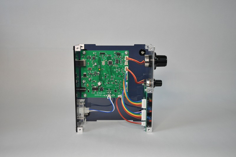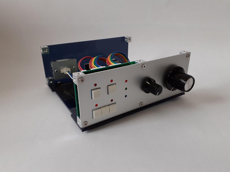 今のところ正面のアルミパネルへの文字入れ方法が決まっていないので、ローコストで見栄え良く仕上げる方法を模索中です。外装コストが電子回路より高くなる点は悩ましいところで、本コントローラではケース(正面のパネルのみアルミ、他はアクリル)及び可変抵抗やスイッチなどの外装部品が6,400円程度、内部のマイコンユニット(上の写真にある緑色のプリント板)が部品原価で5,000円程度と、やはり心臓部である電子回路より外装部品の方が高くなってしまいます。(←設計費とソフトの開発費等は一切含んでいません。)大手のメーカーから販売されている安価なパワーパックでは、電子部品のコストが500円程度であることを考えると、かなりの高級品であるとおわかりいただけるでしょうか?