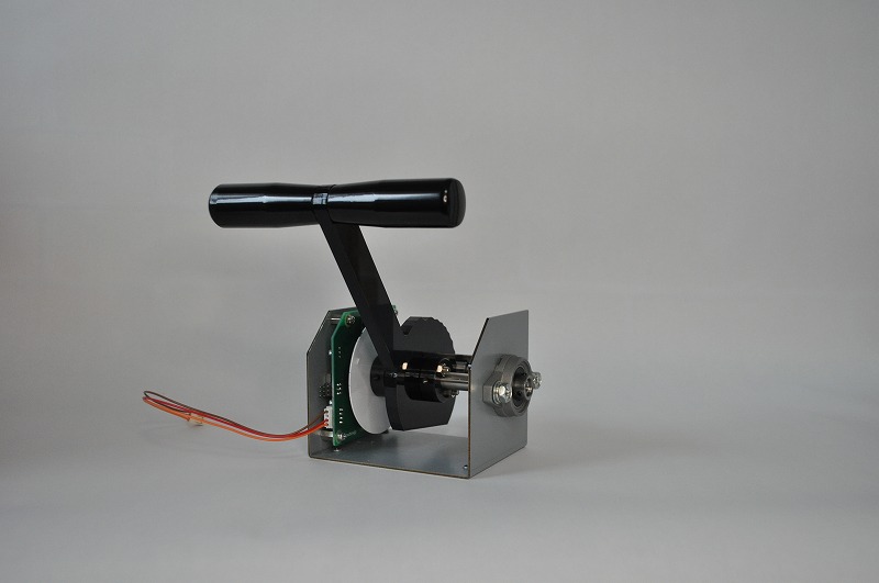 ワンハンドルのレバーユニットはEB-B4-B3-B2-B1-N-P1-P2-P3-P4の10ステップで、レバー位置の検出はフォトリフレクタを使った無接触式として可変抵抗や機械式接点を使った場合に起きる接触不良による不具合を排除しました。コントローラへのインターフェースは電圧に変換して出力しています。機構部分は極力市販品を使ってコストを抑えたかったのですが、それほど流用できるものが無かったためにセンサ基板を含めた材料費が写真の状態(外側の筐体無し)で8,500円程度かかりました。さらにこれをケースに入れるとなると材料費だけで13,000円くらいにはなってしまいますね。