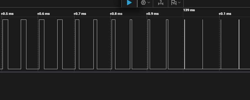 下図はロジックアナライザで取得したPWMの波形です。中央付近から右へかけてパルスの幅が狭くなっていくのがわかると思います。右側の細いところが50Hzのオフにあたる区間で、再びオンの区間へ切り替えるときにも同じように段階的に広げていきます。これで可聴域のノイズを減らせました。