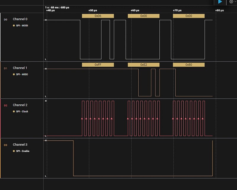 今回試作したものについてはここまで。検討時になぜSPIがうまく動作しなかったのかも含めてブレッドボードで検討を続けたところ様子がわかってきました。SPIを試していると設定を8ビットに収めて送信(SPI1OUT)、続けて8ビットを2回受信(SPI1INを2回)とすることでデータは取れるように。